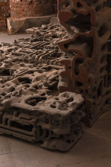 Organicky tvarovaný objekt, navržený Federicem Díazem, vznikl pomocí robotické 3D tiskové technologie (3DCP) a metody SPI z materiálů, jako jsou ultravysokopevnostní beton (UHPC), jíl, metakaolin, bentonit a čedičová vlákna – kombinace propojující geologické vrstvy s technologickými inovacemi.