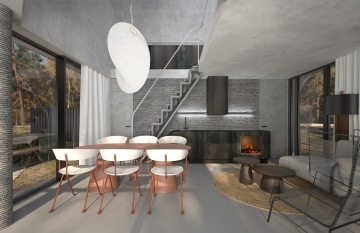 Concierge neboli správcovský domek s kompletním vybavením zahrnujícím společenské prostory, ubytovací zázemí i saunu bude prvním objektem při vstupu do údolí. Drobná stavba archetypálního tvaru se šikmou střechou je navržena pro technologii 3D betonu s částečně prosklenou fasádou. Stavba prezentuje estetické i technologické možnosti 3D betonu jak v konstrukcích, tak při realizaci fasádních panelů, interiérových prvků nebo uměleckého díla.